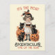 "Es ist die spoktakulärste Zeit des Jahres" Vintages Design aus der Mitte des Jahrhunderts Kleines Mädchen in altmodischer Kleidung steht mit ihren 3 schwarzen Katzenfamiliären und ein paar Jack-o-Laternen