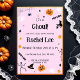Eine einfache, raffinierte Halloween-Babydusche lädt kleine Mädchen ein. Niedliche Gespenster, Kürbis, Fledermäuse, Süßigkeiten, Hexenhüte, Skelette und flüchtige Blick umgeben eine unheimliche Typografie auf rosa Untergrund. Ideal für Herbst- und Halloween-Babyduschen mit orangefarbenen, lila, schwarzen und weißen Farbtönen.