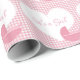 Dieses Packpapier kennzeichnet einen wiederholten Entwurf eines weißen Herzens, mit dem kundengerechten Text, "es ist ein Mädchen". Hinter dem Herzen ist ein rosa und weißes Ginghammuster, und unterhalb des Herzens ist ein rosa Kinderwagen.