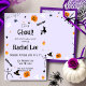 Eine einfache, raffinierte Halloween-Babydusche lädt kleine Mädchen ein. Niedliche Gespenster, Kürbis, Fledermäuse, Süßigkeiten, Hexenhüte, Skelette und flüchtige Blick umgeben eine unheimliche Typografie auf Lavendeluntergrund. Ideal für Herbst- und Halloween-Babyduschen mit orangefarbenen, lila, schwarzen und weißen Farbtönen.