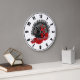 10.75" runde Acrylwanduhr mit einem Cabaret-Bild mit einem schwarzen Top-Hut mit roten Federn und einem roten Bogen, einer schwarzen Feder und einem bekleideten Kopfteil mit Rose, einem roten Boa und dem Text "It's Showtime!" in glänzender silberner französischer Schrift. Sehen Sie sich die gesamte Cancan-Uhr-Sammlung im DECOR an. | Uhrenabschnitt.
