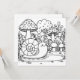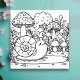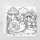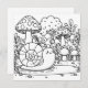Un escargot rampant par de mignons champignons dans un carte pour notes de couleur cottage. Joli poster de coloriage adulte pour enfants, ados ou adultes, Lignes épaisses simples pour faciliter la coloriage.