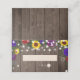 Rustikale Hochzeitsbegleiterkarten mit blühenden Sonnenblumen, Dahlien, Babyatmen und Farne bilden eine schöne Spätsommer- / Herbst/Winterpalette aus Gelb, Rot und Purpel, die auf einem schicken dunklen Holzhintergrund mit Saitenlichtern steht. Ideal für rustikale Hochzeiten im Stall.