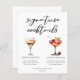 Cette feuille de menu de cocktails sophistiquée vous propose une simple typographie noire au-dessus de 2 de vos boissons préférées et de leurs ingrédients pour votre bar mariage côtier. Un élégant dessin Espresso Martini et Cherry French 75 ajoute une touche amusante à votre menu du bar. Complétez avec les noms du couple et la date de leur réception.