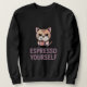 Wake up and purr-fect your day! This adorable grumpy cat sipping coffee pairs perfectly with the punny "Espresso Yourself" slogan. A must-have for cat lovers and coffee addicts who want to show off their playful, caffeinated personality.