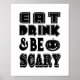 ESSEN SIE DRINK UND SEIN BEÄNGSTIGENDES Halloween Poster. Ein schwarz-weißes Halloween-Poster mit einem lustigen EAT DRINK AND BE BEÄNGSTIGENDEN Zitat. Dieses Halloween-Poster ist nicht nur für Ihr Halloween-Party, sondern auch für jedes Gothic-, Zauberer- oder Horror-Dinner-Party das ganze Jahr über perfekt.