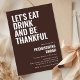 Feiern Sie die Saison mit diesem Esser Drink und werden Sie dankbar, dass die Freunde Dinner Einladung. Diese minimalistische Einladung, die mit fett moderner Typografie in warmen Herbst-Schokoladenbraun-Tönen gestaltet wurde, spiegelt den Geist der Dankbarkeit und des Zusammenlebens perfekt wider. Ideal für Ansammlungen im Erntedank oder für Party im Herbst oder Potlucks, ist diese bearbeitbare Vorlage leicht für Ihre Feier zu personalisieren.