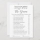 Présentation de la Fête des mariées "Do The Bride Really Know The Groom" de CaMiDesigns. Cette carte minimaliste en noir et blanc ajoute une touche d'élégance à vos festivités de douche nuptiale tout en offrant une façon amusante de tester la connaissance de la mariée de son marié. Parfait pour créer des moments inoubliables et des rires parmi les invités, ce jeu est un ajout délicieux à toute célébration. Pour obtenir de l'aide sur les commandes, l'expédition, les informations sur les produits, etc., veuillez contacter directement le service à la clientèle de Zazzle.