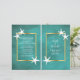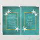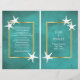 Estarfish blanche sur papier grunge turquoise feutre plié moderne style livret de mariage de plage et programme de fête avec cadre or sur aqua bleu foncé arrière - plan et étoile blanche sur les coins. Cet élégant design mariage d'été fait partie d'un ensemble ou d'une collection de mariages et est un modèle entièrement personnalisable parfait pour un mariage d'été de destination de plage. Vous devrez plier dans le centre pour avoir un programme plié. Choisissez seulement le type de papier de valeur comme il se plie bien.