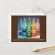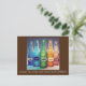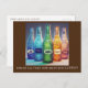 Cette carte postale présente des bouteilles colorées avec des étiquettes qui lisent joie, paix, rire, colère et amour ; le texte en bas déclare : "oubliez tout cela ; et juste du café ?".