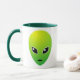 Eine grüne Alien Tasse. Das Motiv wird auf beiden Seiten wiederholt.
