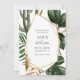 Invitation Save The Date mettant en vedette une verdure tropicale avec un centre géométrique or tendance. Parfait pour l'été et les mariages éco modernes.