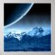 Der raue Kraterplanet erscheint über dem Gipfel der Berge mit seinem Mond.
