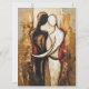 Zwei abstrakte menschliche Formen, eine dunkle und eine andere, verflechten sich in einer warmen, erdigen Palette. Der Hintergrund zeichnet sich durch dynamische Wirbel und Texturen aus, die das Gefühl von Bewegung und Verbindung verstärken.
