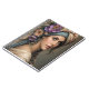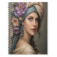 A captivating portrait of a woman with striking blue eyes, adorned with a lush floral headdress and draped in a richly patterned turban. Her gaze is serene, complemented by delicate flower-laden earrings and a soft, flowing garment, evoking a sense of romantic bohemian beauty.