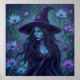 Enigmatic witch in a wide-brimmed hat amid glowing purple flowers, ethereal blue-purple palette, dark flowing hair and mystic stare.