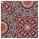 Lebhaftes Stoffdesign mit einem nahtlosen Muster aus roten und weißen Formen und Linien auf schwarzem Hintergrund.
