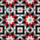 Modernes abstraktes Stoffdesign mit nahtlosem Muster aus geometrischen Formen in Rot, Schwarz und Weiß.