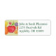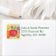 FruchtCollage - Apfel, Orange, Zitrone, Pfirsich, Pflaume, Aprikose, Erdbeere - auf einem Rücksendeetikett.