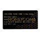 Großes Etikett für Wabengläser in Glas Rohhonig. Personalisieren Sie Ihre Wunschbezeichnung, Adresse und Honignettogewicht. Gelbe und goldene Wabendesign im Hintergrund auf schwarzem Etikett.