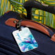Étiquette faite sur commande de bagage montrée dans une impression florale tropicale assez bleue.