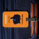 Black cat Cleo sur une étiquette de bagage acrylique orange à un côté. Texte sur le devant personnalisable et personnalisable avec votre nom. Le dos porte la fente de carte pour l'adresse de nom, etc.