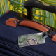 Un robinet à bagages avec un grand hibou à cornes aux yeux larges. Personnalisez ce clic bagage avec les coordonnées de votre choix, telles que votre nom, votre numéro de téléphone et/ou votre adresse e-mail, et utilisez-le lors de vos prochaines vacances.