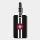 Cette étiquette de bagage noir est prête pour le voyage. Le design moderne comprend une bande noire entourée de rayures blanches sur noir avec un cercle bordeaux au centre duquel sont placés vos trois monogrammes. Sur le dos, vous pouvez customiser votre nom, adresse et numéro de téléphone. Cette étiquette à bagages fait un grand cadeau pour les hommes. Copyright Kathy Henis