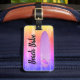 Marque à bagages élégante et brillante avec une planche de surf sur un arrière - plan en détresse. L'étiquette comporte la légende "Beach Babe", qui est entièrement modifiable pour que vous puissiez ajouter votre propre légende, nom ou message. Le verso contient des informations sur le nom et l'adresse, qui sont également entièrement modifiables.