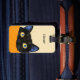 Playful illustration of a black cat with bright yellow eyes peeking over an orange blanket. The curious expression and vivid colors create a fun and eye-catching design, perfect for a luggage tag that adds personality and charm to any traveler’s bag.