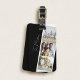 Cette marque de bagage présente un look élégant et moderne avec un arrière - plan noir sur le côté gauche, ce qui crée un contraste saisissant par rapport à la bande de diagonale blanche qui traverse le côté droit. La bande diagonale sert de cadre parfait pour trois photos de famille, capturant des moments joyeux. Les photos sont disposées verticalement, donnant à l'étiquette une sensation dynamique et personnalisée. Sur l'arrière - plan noir, le nom de famille est écrit élégamment dans une police fluide et cursive, ajoutant une touche de sophistication. L'étiquette est attachée à une courroie en cuir noir avec une boucle en laiton robuste, assurant à la fois la durabilité et le style. Cette étiquette de bagage est non seulement fonctionnelle, mais aussi une façon chic de présenter votre famille et personnaliser votre équipement de voyage.
