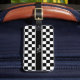 Cette marque de bagage classe est dotée d'un motif en damier noir et blanc qui est l'arrière - plan d'une bande noire pour tenir votre nom, monogramme ou autre texte. Cherchez ID148 pour voir d'autres produits avec cette conception.
