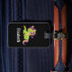 Une étiquette à bagages avec une image d'une licorne de style Frankenstein. Couleurs violettes et vertes. Éffrayant mignon.