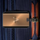 Voyagez dans le style avec cette Elégante Black Copper Monogram Nom Mens Luggage Tag. Ce design est un arrière - plan moderne masculin faux métallique en cuivre, bronze, or et bandes noires. Il est personnalisé avec le nom en lettres noires en gras et votre initiale en beige clair au centre.