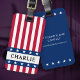 Marque bagage avec rayures rouges et blanches et votre nom personnalisé entre les bordures d'étoiles bleues.