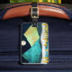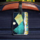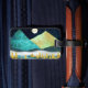 Un magnifique paysage avec des textures uniques montrant un paysage de rivière et de montagne avec une lune montante et ciel étoilé dans les tons de bleu, or, vert foncé et jaune.