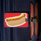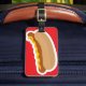 Une illustration stylisée d'un hot-dog avec de la moutarde sur un arrière - plan rouge.