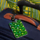 Une étiquette à bagages vert à motif floral facile à reconnaître. Il y a de jolies fleurs colorées contre un arrière - plan vert pâle.