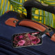 Gros plan de la plaque d'identification décorative lisant Michelle en lettres d'or sur fond de marron avec roses, papillon, et coeurs.