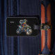 This image features a personalized rectangular luggage tag attached to the handle of a dark blue, textured suitcase. The tag has a sleek black background and displays a dynamic, action-style illustration of a motocross rider in full gear performing a stunt on a dirt bike. The name "Vivian" is printed clearly at the bottom in a simple white font. It is secured to the suitcase with a black leather strap and a silver buckle.