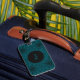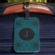 This cool luggage tag boasts a vibrant teal background with a sleek black mandala pattern and a customizable circle for your name! It'll make your bags stand out in style.
