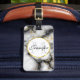 Balises de bagage avec un motif marbré moderne et élégant. Marbre blanc, noir et gris fumé avec de minces rubans de tourbillons en faux or dans tout le motif. Un cercle blanc avec un cadre en faux or superposé avec votre initiale monogramme et votre nom à l'intérieur.