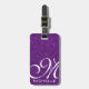 bagage personnalisé à parties scintillant violette avec sangle en cuir : monogramme de gros caractères et nom