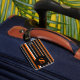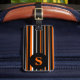 Marque bagage avec bandes de code-barres noir, orange et blanc avec monogramme sur un cercle noir. Personnalisez avec vos informations d'origine, de nom et d'adresse monogramme en utilisant les modèles faciles. La couleur de police, le style de police et la taille de police sont personnalisables.