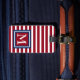 Rayures rouges et blanches classiques avec un monogramme rouge, blanc et bleu patriotique sur le bleu plan et solide avec le texte blanc sur le dos. Personnalisez le monogramme sur l'avant avec votre choix d'initiale et de l'information de contact sur le dos.
