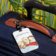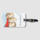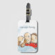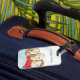 Cette marque de bagage a une illustration d'un mignon chiot et de ses parents, un homme chauve et une femme brune. Vous pouvez customiser le texte.