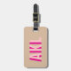 This luggage tag features a shadow-style monogram and hot pink, light pink, and beige tones. The color combination creates a soft, preppy look while keeping the tag easy to spot on bags. It includes space for contact information and an adjustable strap for attaching to luggage.