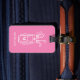 This elegant monogram golf bag or luggage tag features a simple white outline of a golf bag filled with clubs against a vibrant pink background. The design includes a classic serif font initial monogram on the bag, blending seamlessly into the overall look. Below the monogram, the full name is displayed in a matching white serif font for a clean and stylish touch.