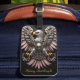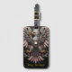 Gros plan d'une sculpture d'aigle finement artisanale, aux détails métalliques et aux accents roses.