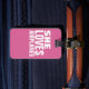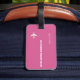 A fun and feminine typographiy design with bold white text 'SHE LOVES AIRPLANES' in a pink-tag, and with additional information at the back... for a woman who is a frequent flyer
